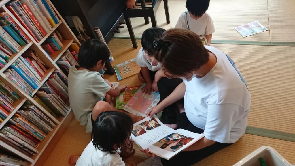 水中出産の絵本を子どもたちに読み聞かせしながら、みんなでイメトレ。