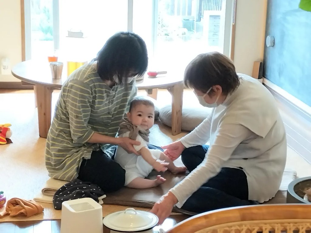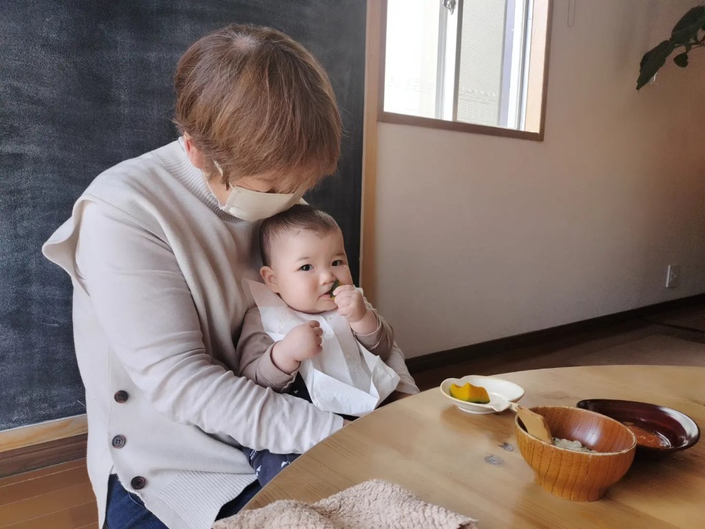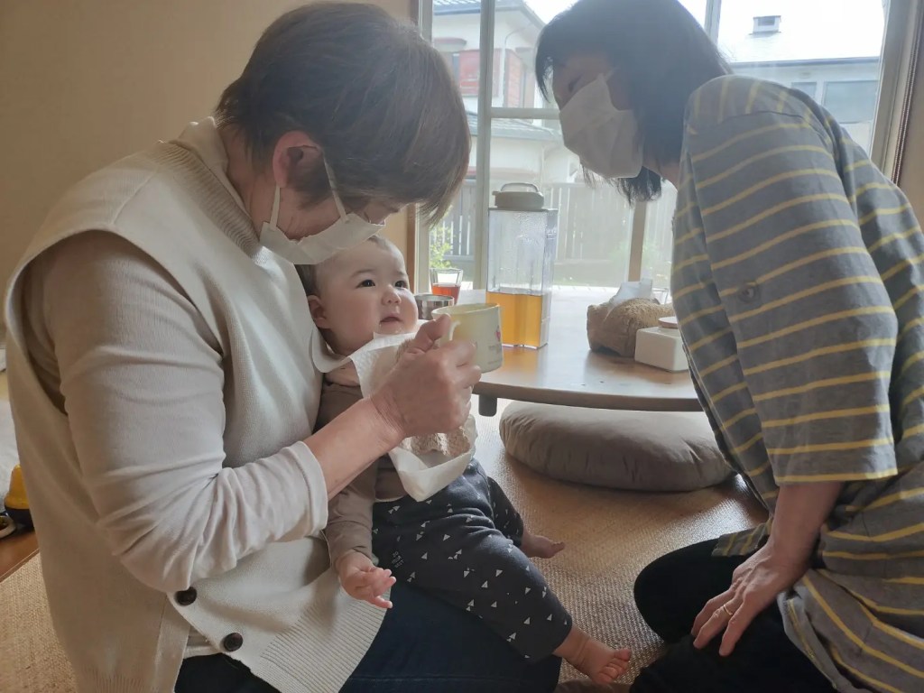 この日は赤ちゃんにとってはじめてのセパレート服、はじめてのお茶、はじめての手づかみ食べを経験しました。