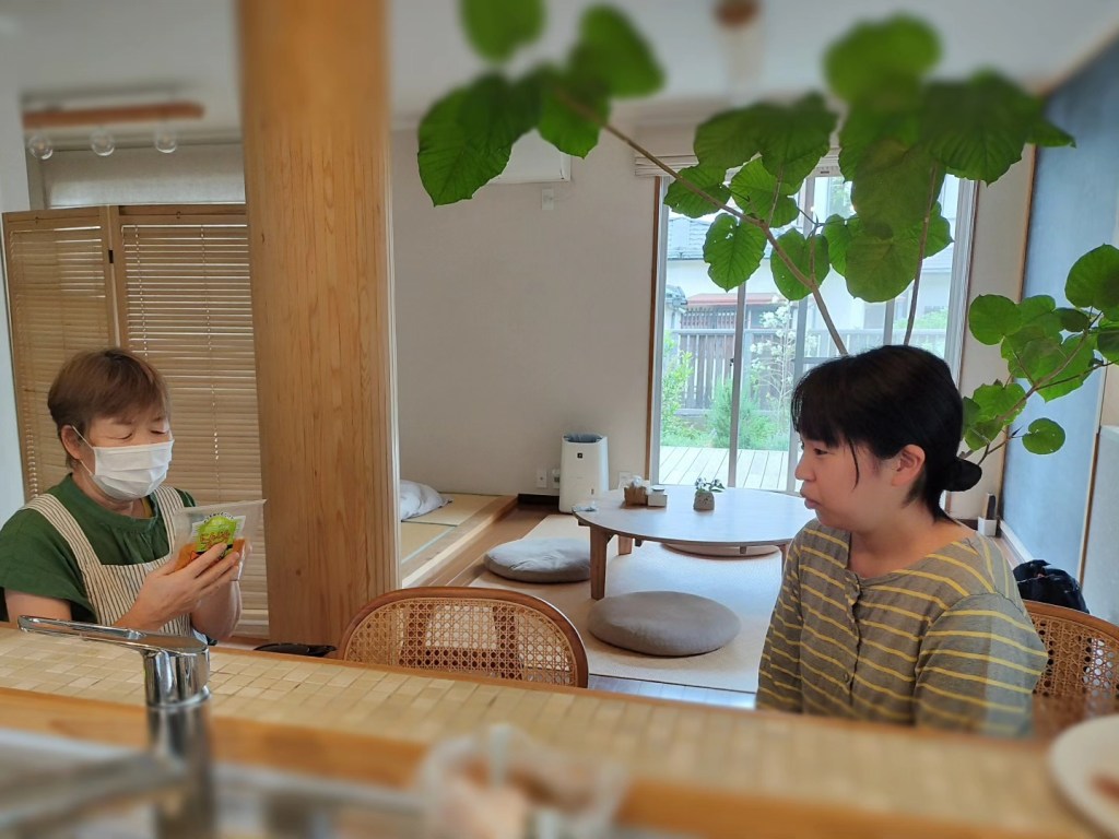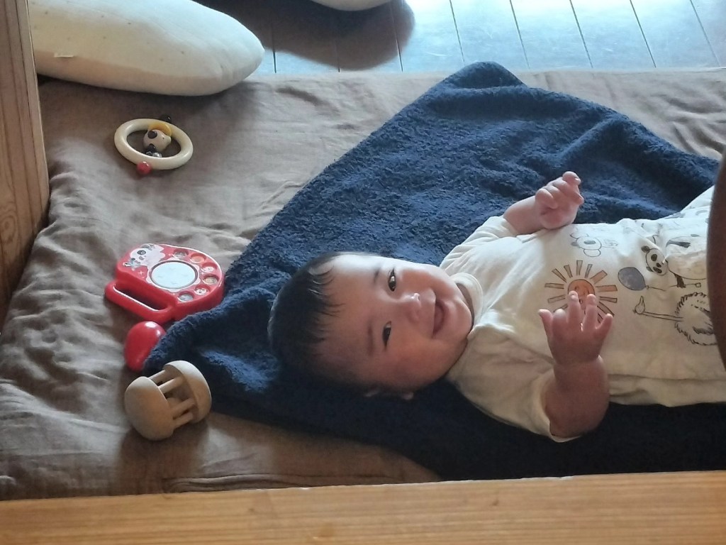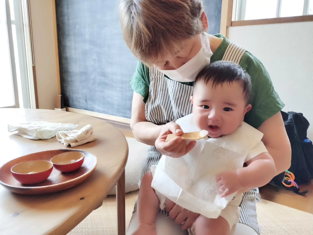 久しぶりに来てくださったリピーターさん。赤ちゃんは5か月を過ぎ、すくすく成長されていました。先週から離乳食をはじめたとのことで、急遽ちょっとだけ離乳食も準備(っと言っても、味付ける前の蒸したじゃがいもを取り分けて、お吸い物用に昆布を浸しておいた水でペースト状にして温めたものと、土鍋にこびりついたごはんに水を足してグツグツしたお粥です(笑))。