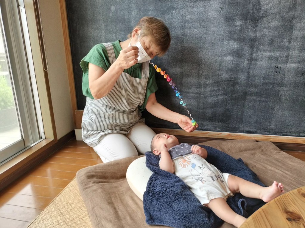 体重測定➡ベビーマッサージ➡セルフケア体操➡お昼寝➡カウンターでおしゃべり➡赤ちゃんの離乳食&授乳➡お昼ごはん➡お昼寝➡整体(※)➡おやつ