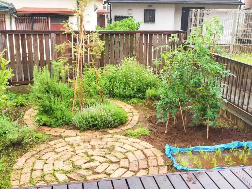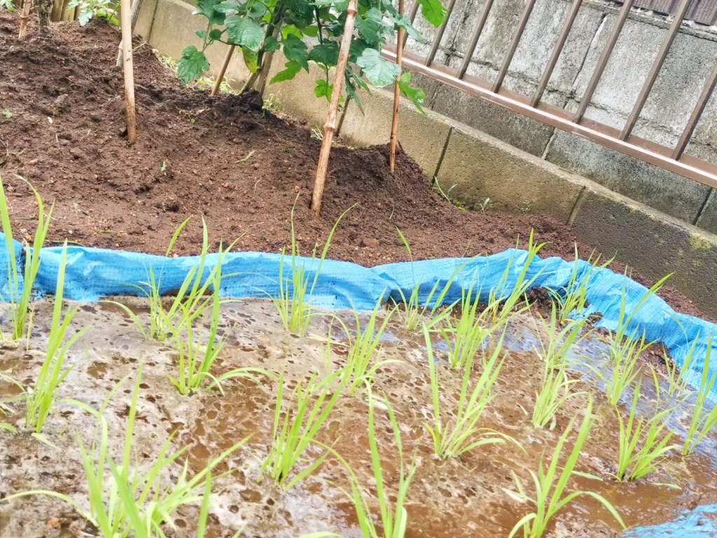 小学校の田植えのお手伝いに行って、おみやげにもらってきた苗を植えるために、庭に小さい小さい田んぼをつくりました。